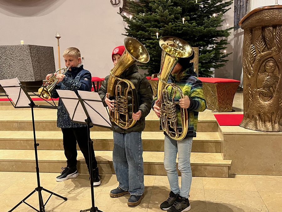 Als Einleitung der Feier spielte das Trio Martin Hackl, Elias Blauensteiner und Anton Trondl „Adeste Fideles“. Am Foto verschwinden zwei der Jungs leider beinahe hinter ihren großen Instrumenten. Es war ganz großartig, wie mutig und cool sie vor der vollen Kirche gespielt haben. Und ebenso cool ging es weiter, als die jungen Musiker*innen der Kapelle ihre extra für die Mette einstudierten Lieder spielten – ein tolles Projekt, das das Weihnachtsgeschehen in jugendlicher Frische betonte, und