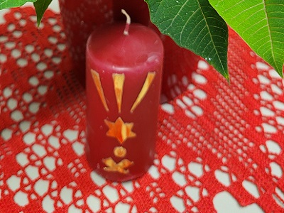 Das Kerzenmotiv diesmal symbolisiert die göttliche Herkunft des Jesuskindes in der Krippe und die Strahlkraft von Gottes Liebe.