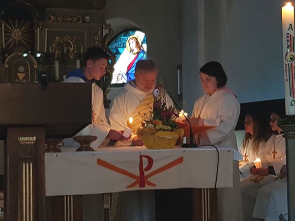 Jesus ist auferstanden. Er hat den Tod überwunden. Die Osternacht wird in der Dunkelheit gefeiert und zeigt uns die Realität des Lebens und die Hoffnung unseres Glaubens. Die Dunkelheit der Nacht zeigt uns die Finsternis des Grabes und versinnbildlicht den Tod. Das Licht steht für Leben und Auferstehung. Heuer haben wir mit Diakon Karl Mayerhofer-Sebera die Kartage und die Osternacht gefeiert. Mit der Osterkerze und dem Ruf „Christus, das Licht“ wurde Jesus als Sieger über den Tod und als Zeichen des Lichtes verehrt. Im Anschluss an die Osternachtfeier gingen wir mit dem Licht der Osterkerze zu den Verstorbenen am Friedhof.