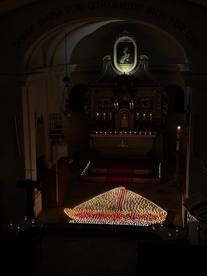 Zum Thema „Wasser“ wurden über 1500 Lichter entzündet, die die Pfarrkirche und den Kirchenplatz in ein stimmungsvolles Meer aus Kerzenschein tauchten. Ein Boot im Altarraum, als Symbol für Leben und Hoffnung, stand im heurigen Jahr im Mittelpunkt. Der Brunnen, die Heilquelle und das Wahrzeichen von Gutenbrunn, wurde ebenfalls ins Licht einbezogen und verwandelte den Kirchenplatz zu einem Ort des Innehaltens. Gestaltet wurde die „Nacht der 1000 Lichter“ mit besinnlichen Texten und stimmungsvoller Musik von Klavier und Querflöte (Jasmin und Simone Haberzett sowie Nadine Rainer) unter der Leitung von Mag. Birgit Juster. Herzlichen Dank für die Vorbereitung und Abwicklung an Birgit, Jasmin, Selina und Simone Haberzett sowie Martina Aigner.