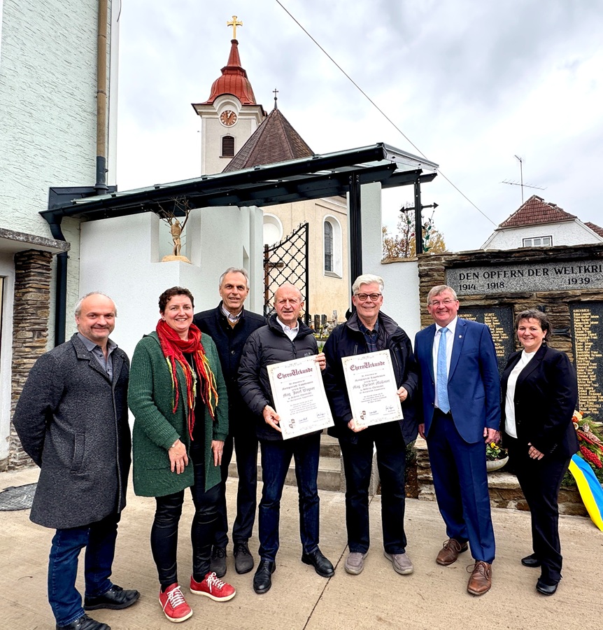 Bürgermeister Ing. Josef Wanger überraschte Mag. arch. Josef Wagner - sowie den ebenso zur Präsentation geladenen mehrfachen Buchautor über Kirchbach und gebürtigen Kirchbacher, Mag. Norbert Müllauer - mit der Verleihung der Silbernen Ehrennadel der Marktgemeinde Rappottenstein, einer wahrlich würdigen Auszeichnung der beiden engagierten Preisträger.