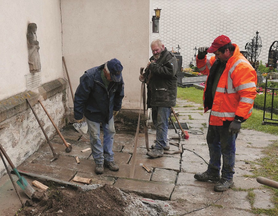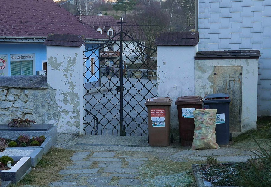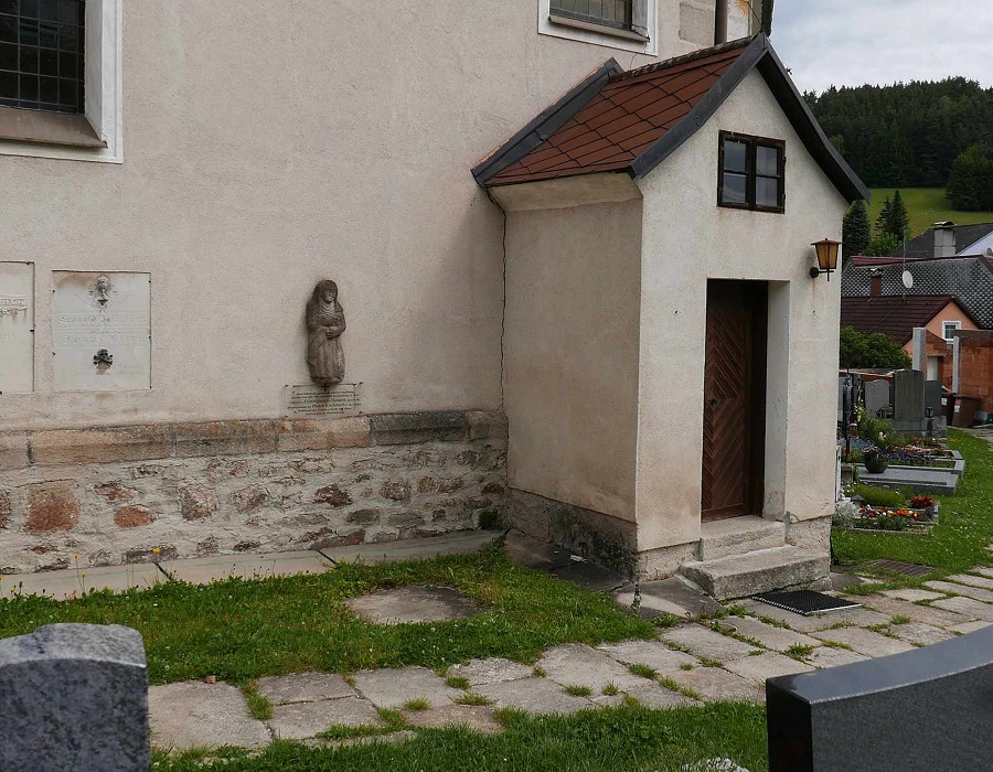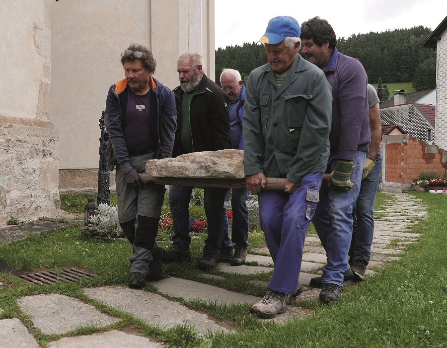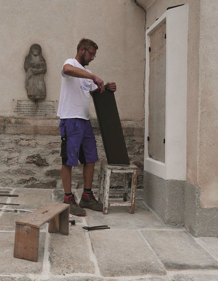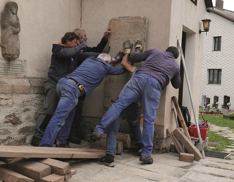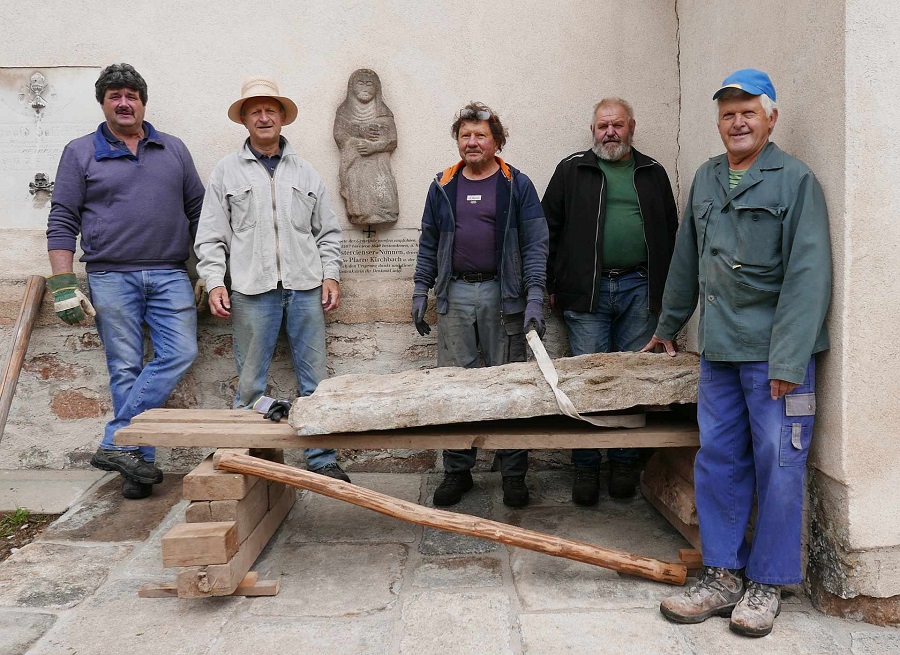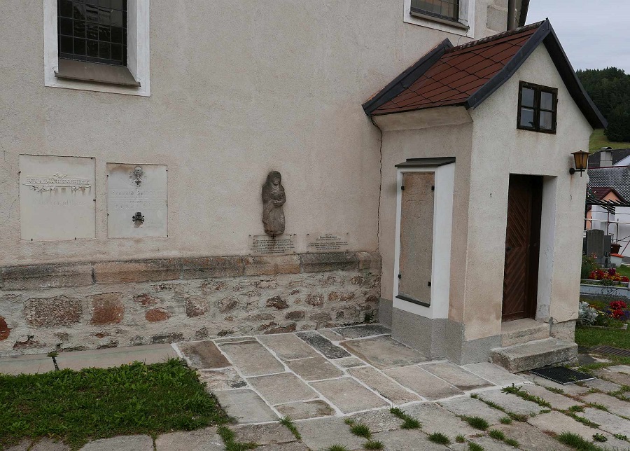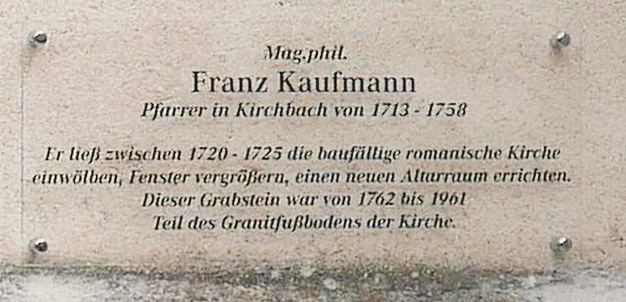 Seiner Tatkraft, seiner Umsicht und seiner Entschlossenheit ist es zu verdanken, dass unser Kirchenraum die Gestalt bekam, in der wir bis heute unsere Gottesdienste feiern dürfen. Er ließ als Bauherr in den Jahren von 1720 – 1725 die Kirche einwölben, die kleinen romanischen Fenster vergrößern und vor allem einen großzügigen, lichten Altarraum schaffen. Vor genau 300 Jahren fanden diese großen baulichen Anstrengungen ihren Abschluss. Der Grabstein, der fast 200 Jahre lang Teil des Granitfußbodens der Kirche war, wurde im Zuge der Innenrenovierung der Kirche im Jahr 1961 aus der Kirche entfernt und in diesen Mauerpfeiler neben dem Friedhofstor eingemauert. Seit der organisierten Entsorgung der Friedhofsabfälle in den 1980iger Jahren (?) fristete er aber ein eher trauriges Dasein hinter den Müllcontainern. Die aktuelle Neugestaltung des Friedhofsaufganges machte es erforderlich, dass der eingemauerte Grabstein ausgelöst und zwischengelagert werden musste. Bei der Suche nach einem neuen, würdevollen Standort für den Stein der an eine für unsere Kirche so bedeutende Persönlichkeit erinnert, fiel die Entscheidung auf die Westwand des Sakristeieinganges. Mit Granitplatten des ursprünglichen Kirchenbodens wurde zuerst ein kleiner Vorplatz gepflastert. Der Grabstein, (ca. 300 kg!) wird an den Ort der Neuversetzung getragen, auf den vorbereiteten gemauerten Sockel aufgestellt, fixiert, eingemauert und ver- putzt. Die Blechabdeckung des Mauerkörpers machte der Spengler Andreas Vogl aus Lembach. Zusammen, mit den beiden eingemauerten Gedenktafeln für verstorbene Priester und der mittelalterlichen Figur einer Zisterziensernonne bildet der hier neu versetzte Grabstein des Pfarrers Franz Kaufmann einen würdigen Gedenkort an der Südseite der Pfarrkirche in Kirchbach.
