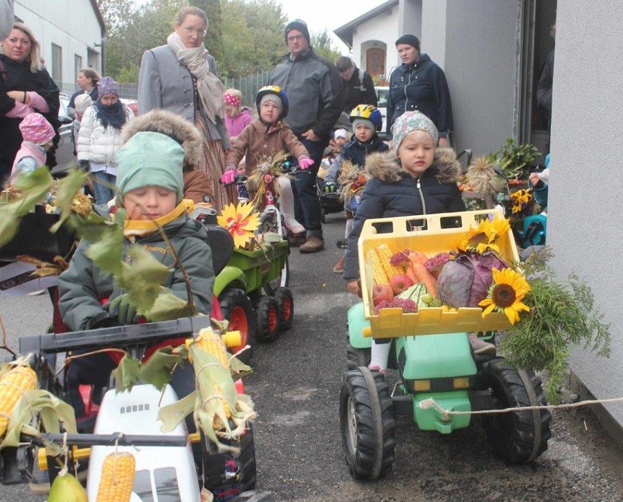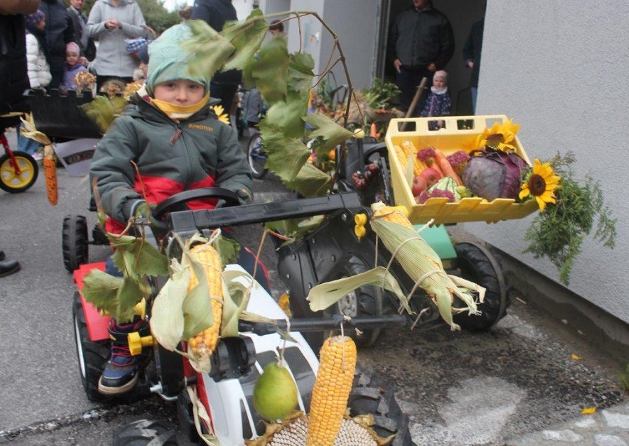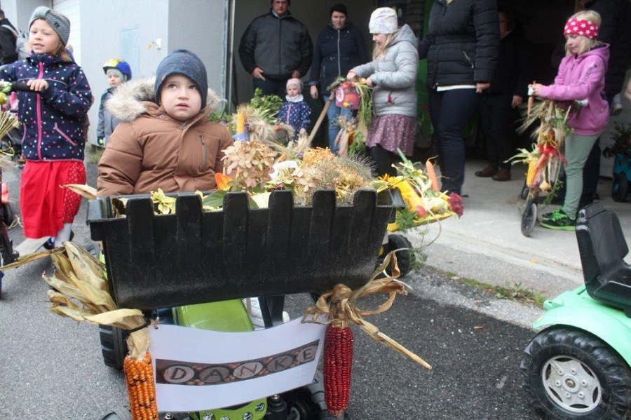 Erstmals unterstützten heuer, auf Initiative der Frauenbewegung, 15 Kinder mit ihren geschmückten Traktoren, Bobbycars, Scheibtruhen, Rollern und Fahrrädern den festlichen Zug mit der Erntedankkrone der Landjugend.