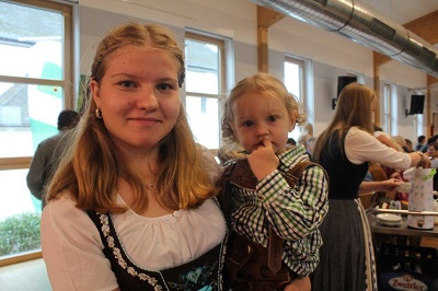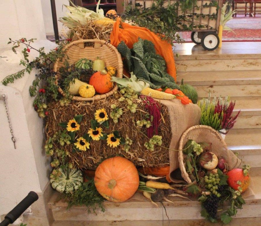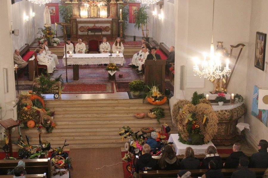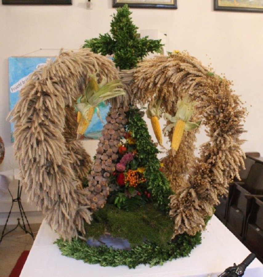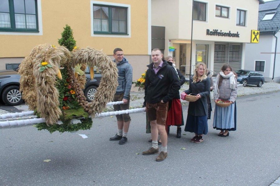 Auch die Minis zogen ihren befüllten Leiterwagen, in dem von jedem eine Erntegabe lag. Musikalisch begleitet wurde der Festzug von der Musikkapelle. Die Erntefahrzeuge zogen mit in die Kirche ein und schmückten somit den Platz vor dem Altarraum. Mit einem Gedicht der Kinder wurde der Wortgottesdienst eingeleitet. Der Kirchenchor und die Musikkapelle gestalteten die festliche Feier. Ein weiteres Highlight war das Vater Unser, gespielt von den Schuhplattlern mit der Steirischen Harmonika und den Glocken. Im Anschluss an den Gottesdienst ließen die Besucher das Erntedankfest beim Erntedankcafe der Landjugend ausklingen.