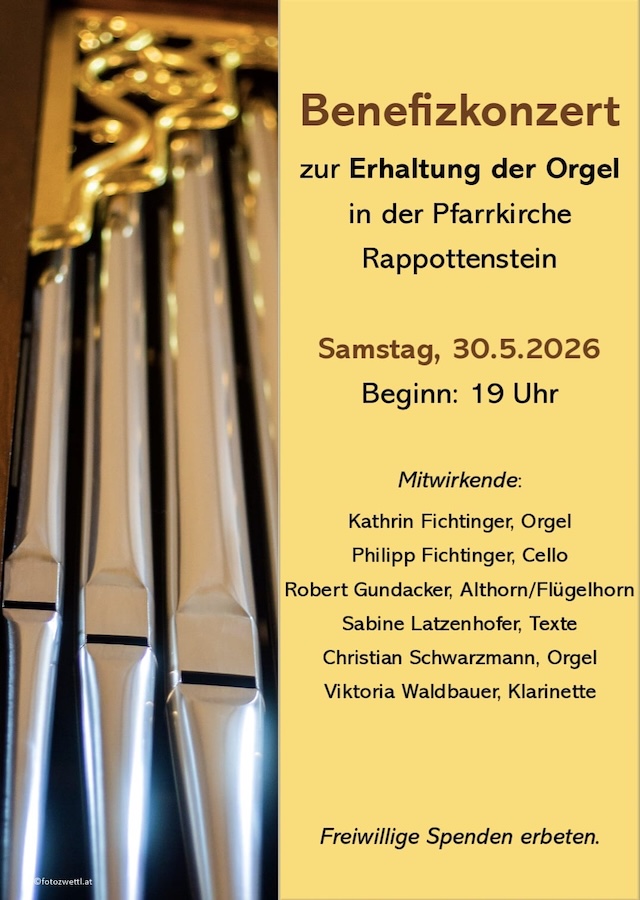 Am Samstag, 30. Mai 2026 findet um 19:00 Uhr ein Benefizkonzert zur Erhaltung der Orgel in der Pfarrkirche Rappottenstein statt.