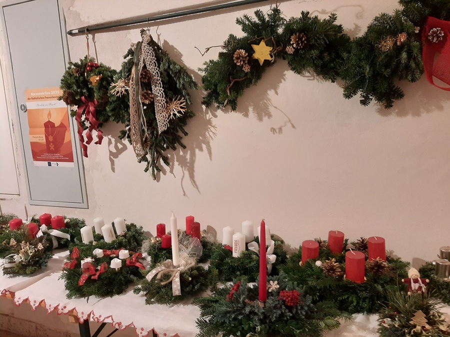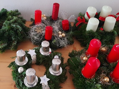 Es wurden Kränze gebunden und verziert, kleine Gestecke gebastelt und am Freitag Vormittag noch die gespendeten Kekse verpackt. Samstag Nachmittag und Sonntag Vormittag bestand die Möglichkeit aus dem gefertigten Sachen das eine oder andere auszusuchen und zu erwerben. Die Einnahmen aus dem Verkauf von diesen Artikeln wurde an verschiedene karitative Einrichtungen und Institutionen gespendet.