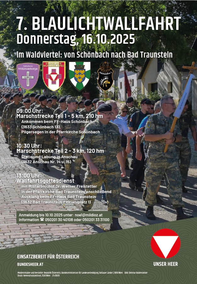 Einladung zur 7. Blaulichtwallfahrt von Militärkommando NÖ, Blaulichtorganisationen und Militärseelsorge
